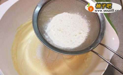 33、加入1/2过筛粉,1/2椰浆,用橡皮刮刀略翻拌均匀,再加入剩下的粉类、椰蓉及椰浆拌匀。