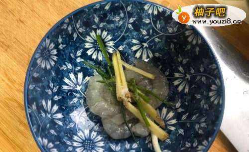 把姜、葱、料酒倒进虾仁里腌制片刻