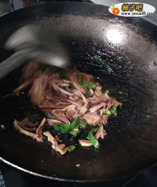 3放入切好的青椒丝、焯好的肚丝,加入少许糖、麻油、冷水,翻炒至成熟