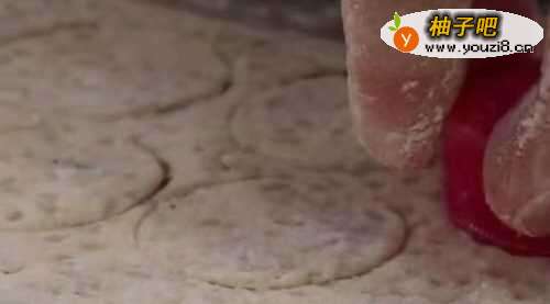 4把面团揉成一个圆面坯,先按平,再用擀面杖擀成又大又圆,薄厚均匀的大饼。再用矿泉水瓶盖按成一个个的圆片。见下图