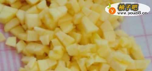 5趁这个空闲时间我们把苹果去核,切成小丁儿。温馨提示:苹果要选择水分少,俗话说面一点的品种,这样在煮的过程中不容易出水,适合烘焙用。
