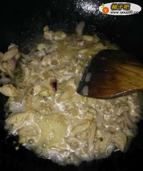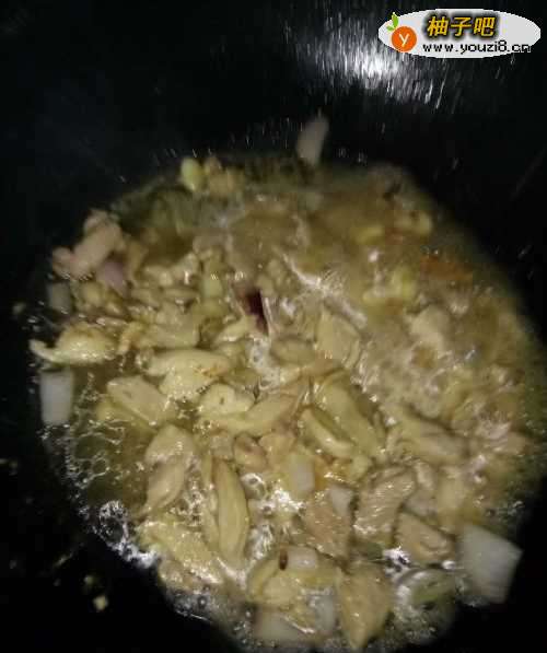 3开火,加入适量的食用油,油热后,将洋葱和鸡肉下入锅里炒香;