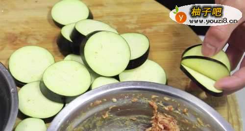 44.把茄子一块一块切好以后,取出肉馅把肉馅旁边准备一小盆清水,先把小勺子粘一点清水,防止肉馅粘在勺子上面,挖点肉馅把茄夹装满肉馅,用勺子按一按,可以多装一点肉馅吃起来更香更解馋