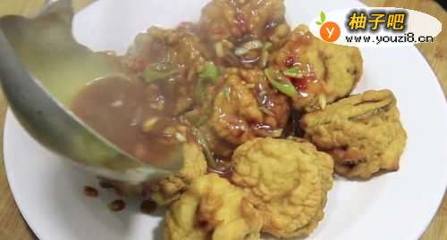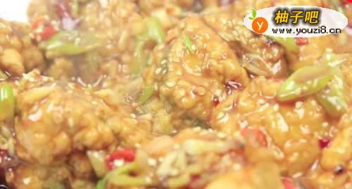1010.最后勾入一点水淀粉把汤汁熬至粘稠起泡,起锅把汤汁倒在茄夹上面,撒上一把白芝麻即可食用了。