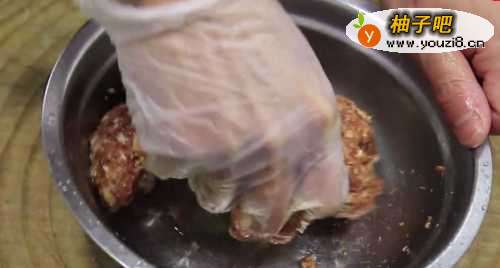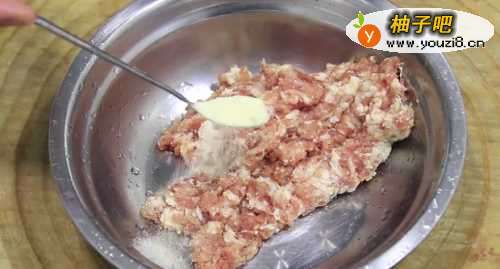 1.首先准备瘦肉一块,先切成肉片,在剁成肉沫放入盆中,加入食盐2克、鸡粉1克、胡椒粉0.5克、然后顺着一个方向不停的搅拌摔打,使调料拌匀化开,让肉末充分的吸收调料。