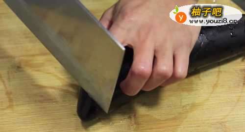 33.在这个时间我们把茄子处理一下,切去茄子的蒂和尾部,如图中所示第一刀和第二刀不要切断茄子 从第三刀处切断,每一刀的厚度0.3厘米。