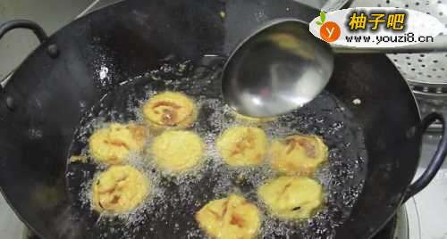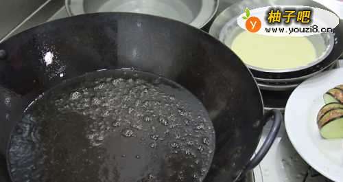 77.锅内烧油,油温烧至5成热后,把茄夹挂上面糊,放入到锅内炸制,小火慢炸把茄夹的表面炸制金黄,浮出油面后即可捞出控油。