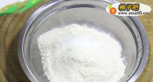 66. 准备一个小盆,放入面粉、淀粉、泡打粉2克、白糖2克,加入清水搅拌成糊,在打入一个鸡蛋充分搅匀。