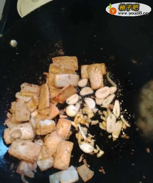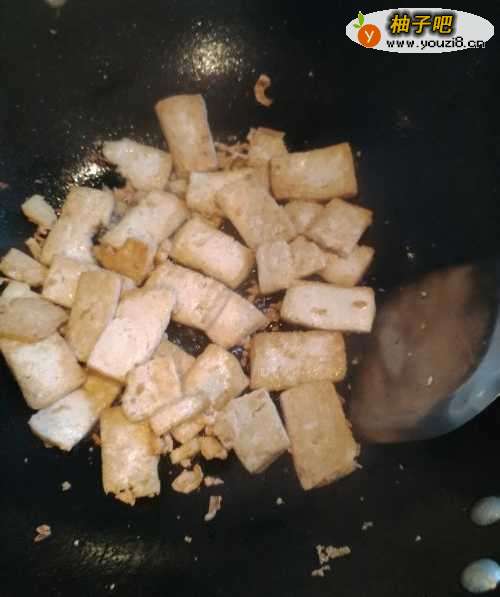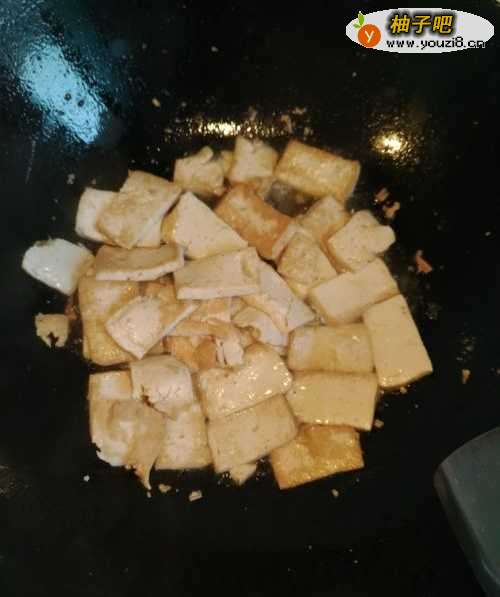 4第四步,在锅里倒入适量花生油,等油七八分熟以后倒入切好的豆腐,把豆腐在油锅里翻炒,翻炒至两面焦黄。