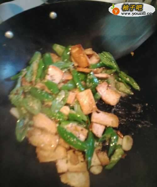 5第五步,加入生姜和葱,翻炒一会,倒入青椒,继续翻炒。
