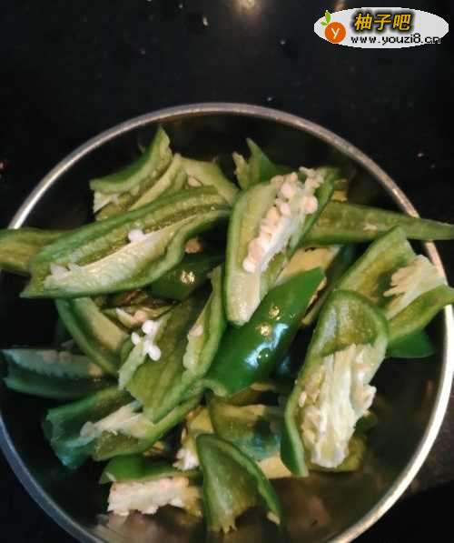 2第二步,把青辣椒洗干净以后,切成小块装碗里。
