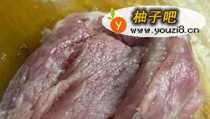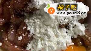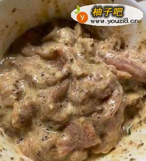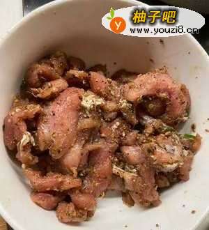 4蚝油,酱油,盐,花椒粉,葱姜和里脊拌匀,腌制15分钟