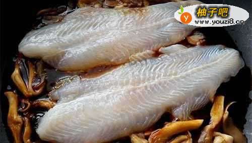 3将秀珍菇稍微拨到旁边,中间放入退冰的巴沙鱼排。