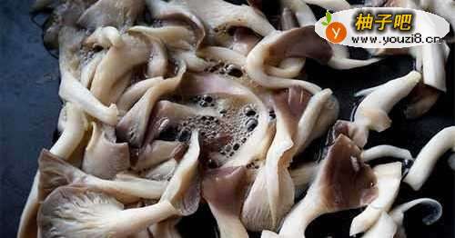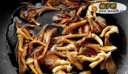 秀珍菇洗净后用手撕成小条,放入锅中炒至出水。