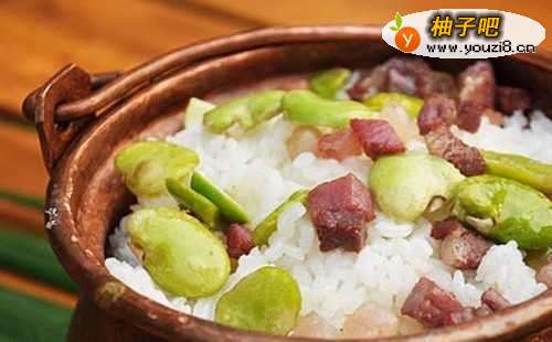 豆焖饭永胜坝区土地肥沃,青蚕豆角一般连皮带豆米均可煮食,民间还常将其加工成青豆焖饭待客。其做法是将青蚕豆角截碎,配上火腿丁,倒进锅里翻炒几遍,再加上泡发了半个小时的上等大米,加水后煮上汽,然后用文米焖熟,加上精盐翻抄拌均,即可佐茶食用。这种食品看上去豆绿饭白肉红,吃起来豆甜饭