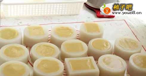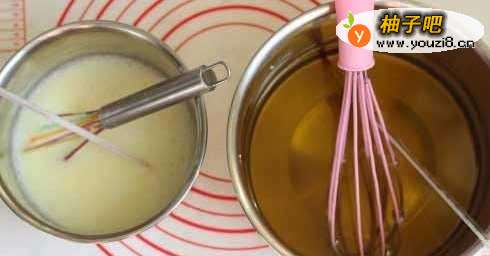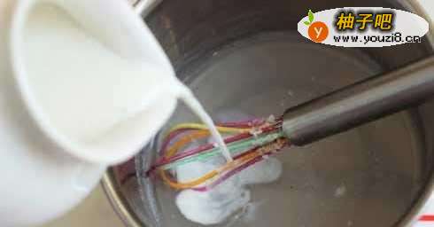 4准备好180牛奶,等到碱液的温度降低到30°左右的时候,再将牛奶慢慢倒入,边倒入边搅拌