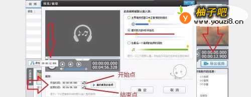8进入音频【预览/截取】界面时,根据视频的时间去点击音乐播放进度条,然后确认音乐的起点和终点(也能手动输入时间),最后在右边选择插入方式,通常使用默认的,除非是添加多个音乐才会使用最后一个按钮。