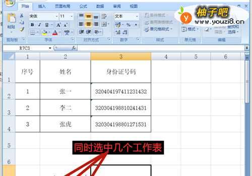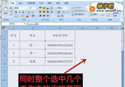 7几个工作表的内容范围同时被选中。