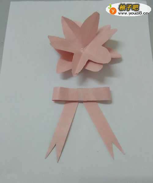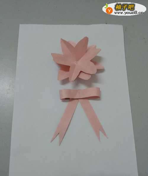 17把蝴蝶结和飘带粘在花朵的下方,立体花朵贺卡就做好了。