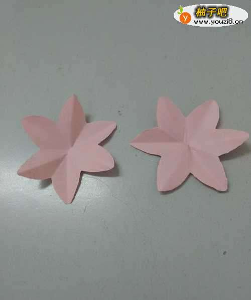 9把彩纸开启,得到两个六个花瓣的花朵。