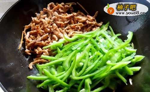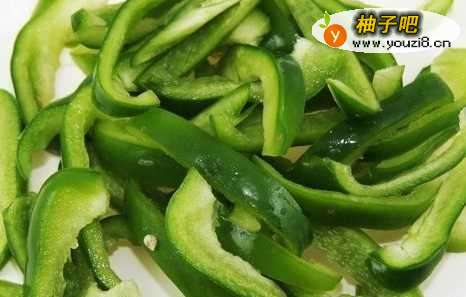 58.调入适量生抽、香醋,放入青椒,翻炒均匀;
