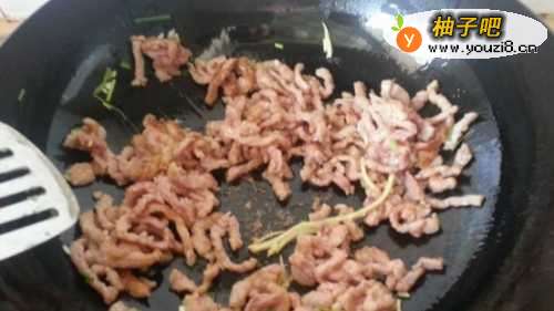 34.炒锅置火上争暗激,倒入适量植物油烧热;放入肉丝大火翻炒;
