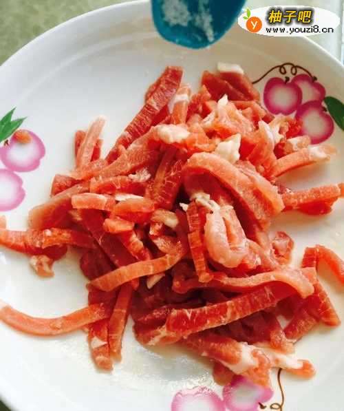 1.猪瘦肉洗净,切成粗一点的肉丝;
