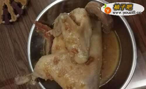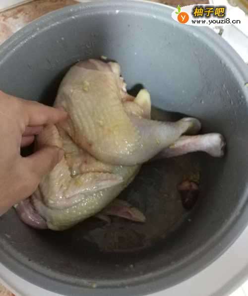 4鸡涂好调料后,先不要急着煮熟,先把涂好调料的鸡,放在电饭煲中静静地腌制15分钟左右 ,让鸡肉更好地入味 。