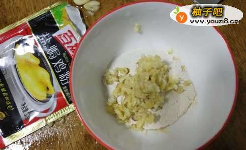2把姜和蒜剁碎,再洗好一个小碗,把盐焗鸡料倒到小碗中 ,把切碎的姜和蒜也放进去 。