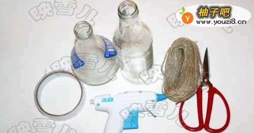 瓶子,双面胶,胶枪,麻绳,剪刀