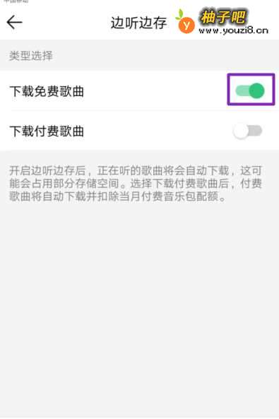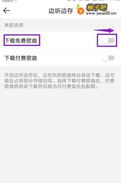 6弹出的界面,我们能看到下载免费歌曲,我们将下载免费歌曲的开关向右滑动;