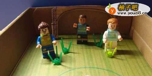 接着,在硬纸板玩具足球场摆放积木人物和积木足球,看整体效果,如下图所示。
