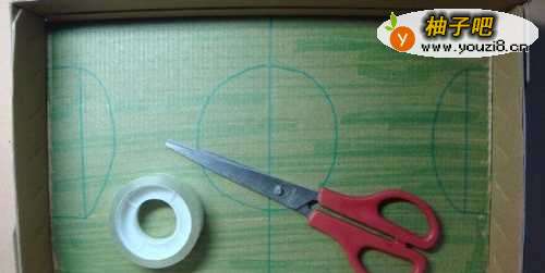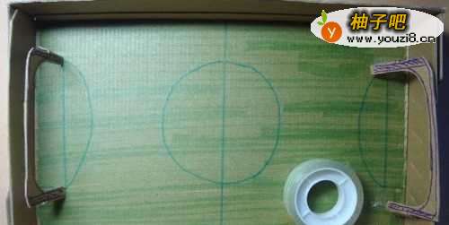 然后,用透明胶把球门图形粘在纸板盒子上,这样好看的硬纸板玩具足球场就制作好了,如下图所示。