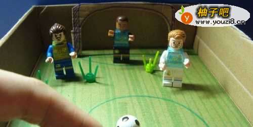 最后,能告诉孩子,通过手指弹积木足球到球门中,在硬纸板玩具足球场中比赛,如下图所示。喜欢手工制作的朋友们,也来动手做做吧。