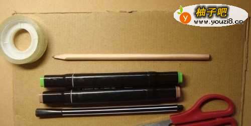 在制作硬纸板玩具足球场的材料和工具有,硬纸板、铅笔、彩色笔、马克笔、剪刀、透明胶、直尺,如下图所示。