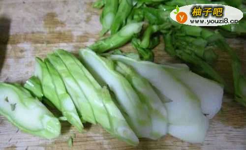 2然后将梗和旁边的细枝切开,将其中的粗梗切成片