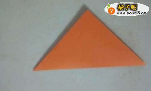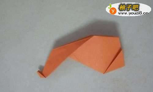 7把长颈鹿的头部折好,我们再到长颈鹿的尾巴咯,先在尾部折出一个小三角形,再折一个梯形,如下图