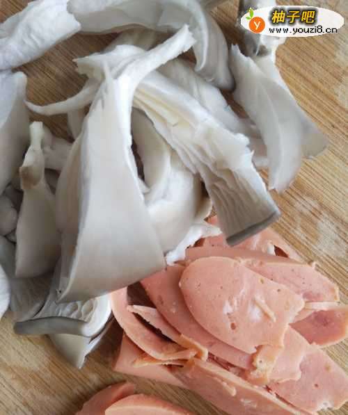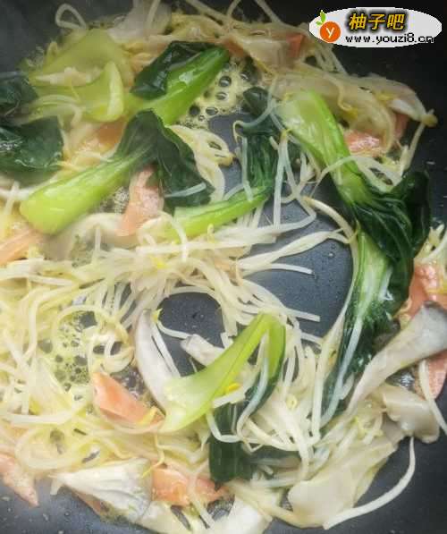 4炒锅中放少许食用油,把蘑菇、青菜、豆芽、火腿肠倒畜茄入锅中炒熟。
