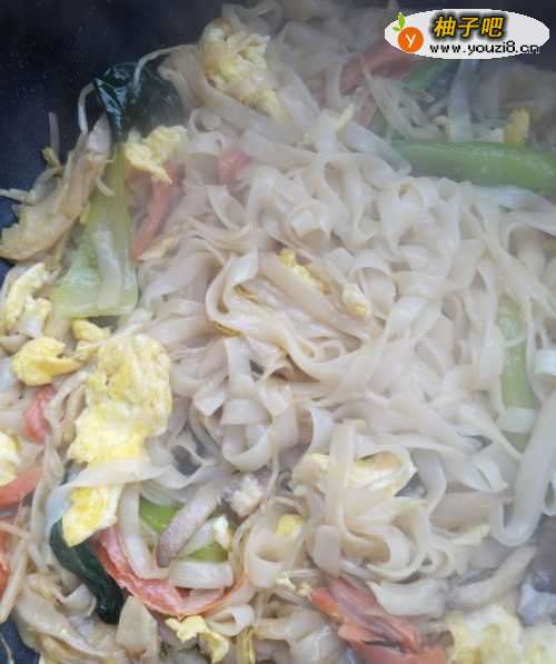 5接着,加入鸡蛋、河粉,用筷子搅拌均匀。