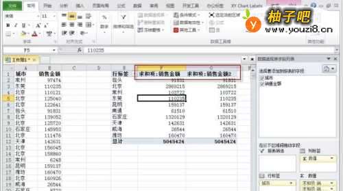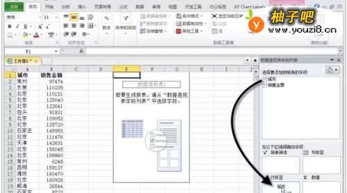 将“销售金额”拖动到【数值】区域,这个要执行两次,即将“销售金额”拖动两次到【数值】区域