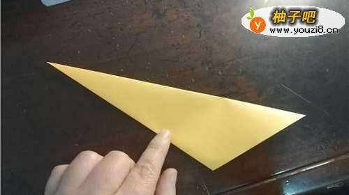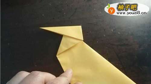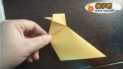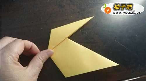 5小黄鸡的嘴巴折好后如图一,我们再把尾巴向内折,如图所示。