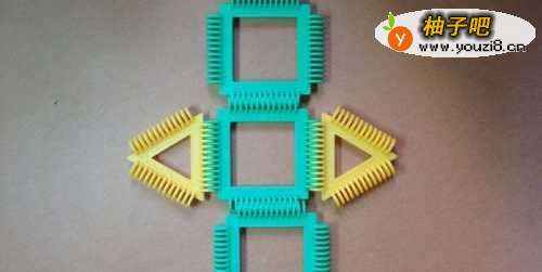 6然后拼装跳街舞的小男生的手掌部分。由两个三角形积木所组成,摆放的位置,如下图所示。这样一个跳街舞的小男生积木拼装画就做好了。