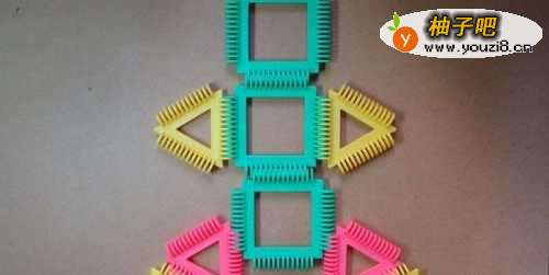4然后拼装跳街舞的小男生的腿部分。由两个三角形积木所组成。摆放的位置,如下图所示。