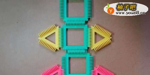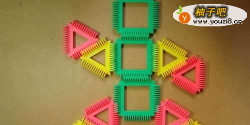 3接着拼装跳街舞的小男生的手臂部分。由两个三角形积木所组成。摆放的位置,如下图所示。