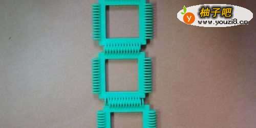 2这里先拼装变形的跳街舞的小男生的头部和身体部分。由三个正方形积木所组成。摆放的位置,如下图所示。