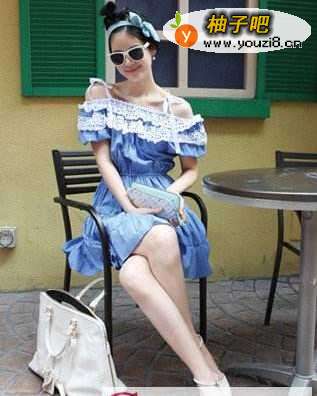 牛仔蓝的棉布连衣裙,领部繁复的蕾丝边作为装点,蓝白相搭感觉清晰分明,精致而甜美,华丽丽的韩国风,露肩的设计突显出圆润的肩部线条和修长的脖颈,充满了夏日的性感与浪漫,俏皮的蝴蝶结绑带设计很有少女感,加上的松紧腰身让裙子的层次感毕现,勾勒出迷人的身体线条。