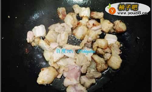 3稍微榨一会,注意翻转两侧,让其都受热一下,榨出少许油脂,这样吃起来不油腻,将榨好的五花肉捞出,加入少许盐巴、酱油、料酒、醋等腌制一会。