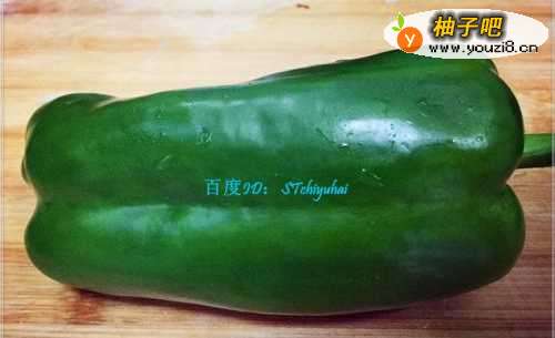 4准备一个青椒,将青椒清洗干净,对半切开,剜去蒂头部分,掏干净内部的籽,然后切成块状。