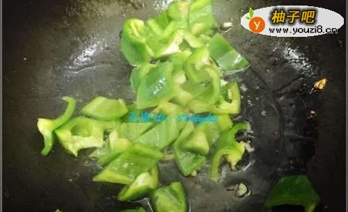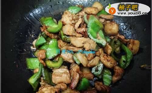 6先放入切好的青椒,爆炒一会,待青椒变软加入腌制的五花肉。