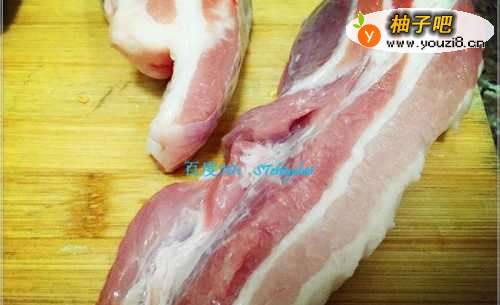 准备一块五花肉,让卖肉师傅帮忙去皮一下,过水清洗一边,沥干,然后切成薄片状。
